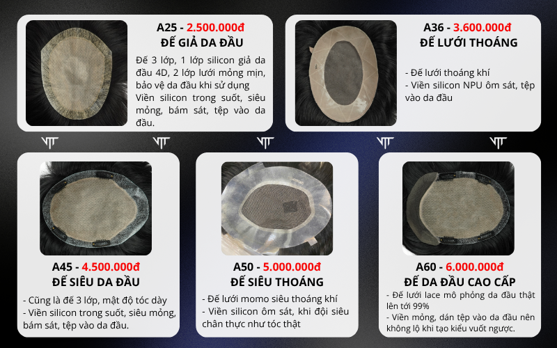 Hiện tại VTT HAIR có 2 dòng chính: Tóc nguyên đầu (full wig) cho các anh đầu trọc, không thể mọc tóc xung quanh, và tóc nửa đầu (tóc hói chữ M, chữ U) cho các anh tránh cao, hói đỉnh.
